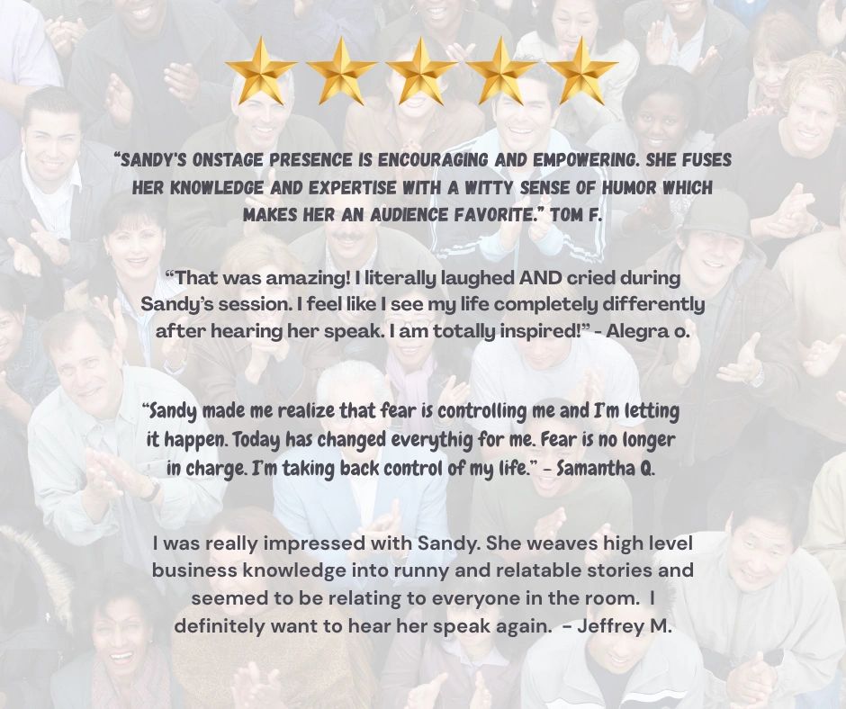Sandy is a public speaker and author of The Fearless Revolution: 7 Secrets to Becoming Fearless. She describes herself as being imperfect and in process, and yet walking BOLDLY in her purpose – because those things are not mutually exclusive.